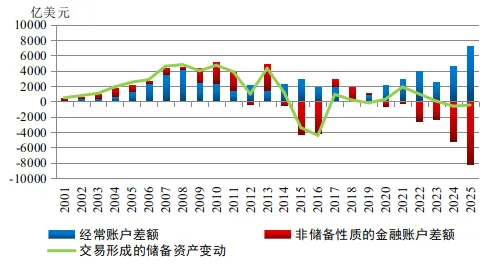 2025年,我国经常账户顺差和非储备性质金融账户逆差同步增加,反映与世界经济联系更加紧密,以更加开放姿态融入全球。由经常账户顺差形成的资金流入,转化为金融账户下的对外投资运用,实现收支平衡。