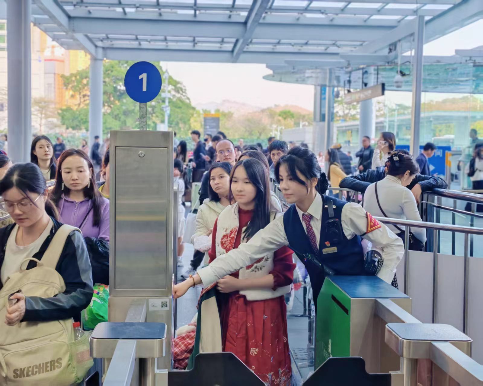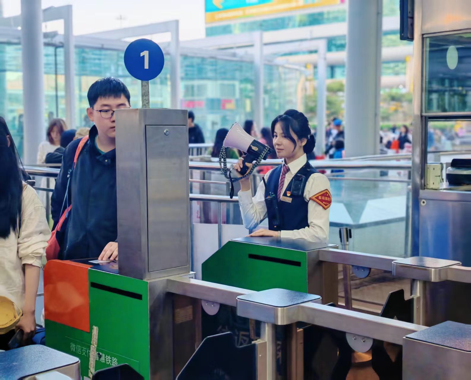 清晨,客运值班员刘洋洋站在深圳站进站口,手里的喇叭还没举起,旅客就涌了过来。刘洋洋侧身避开行人,来到人群中大声提醒。